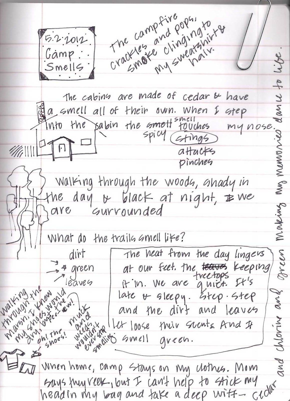 Earlier this week I was overpowered by the smell of school. This led me to write my slice this week. Writing my slice this week made me think about capturing scents and led me to my notebook for a little play and discovery. One of the things people commented on regarding my slice was the combination of concrete and abstract descriptions of smells. I coupled pencil shavings with possible dreams. I wanted to try a little of this in my notebook. As I was writing, I also noticed my choice of verbs helps carry the smell off the page. Capturing a scent in my notebook is about much more than description or comparison. It is setting and verbs and abstract nouns working together to create a scent for the reader.