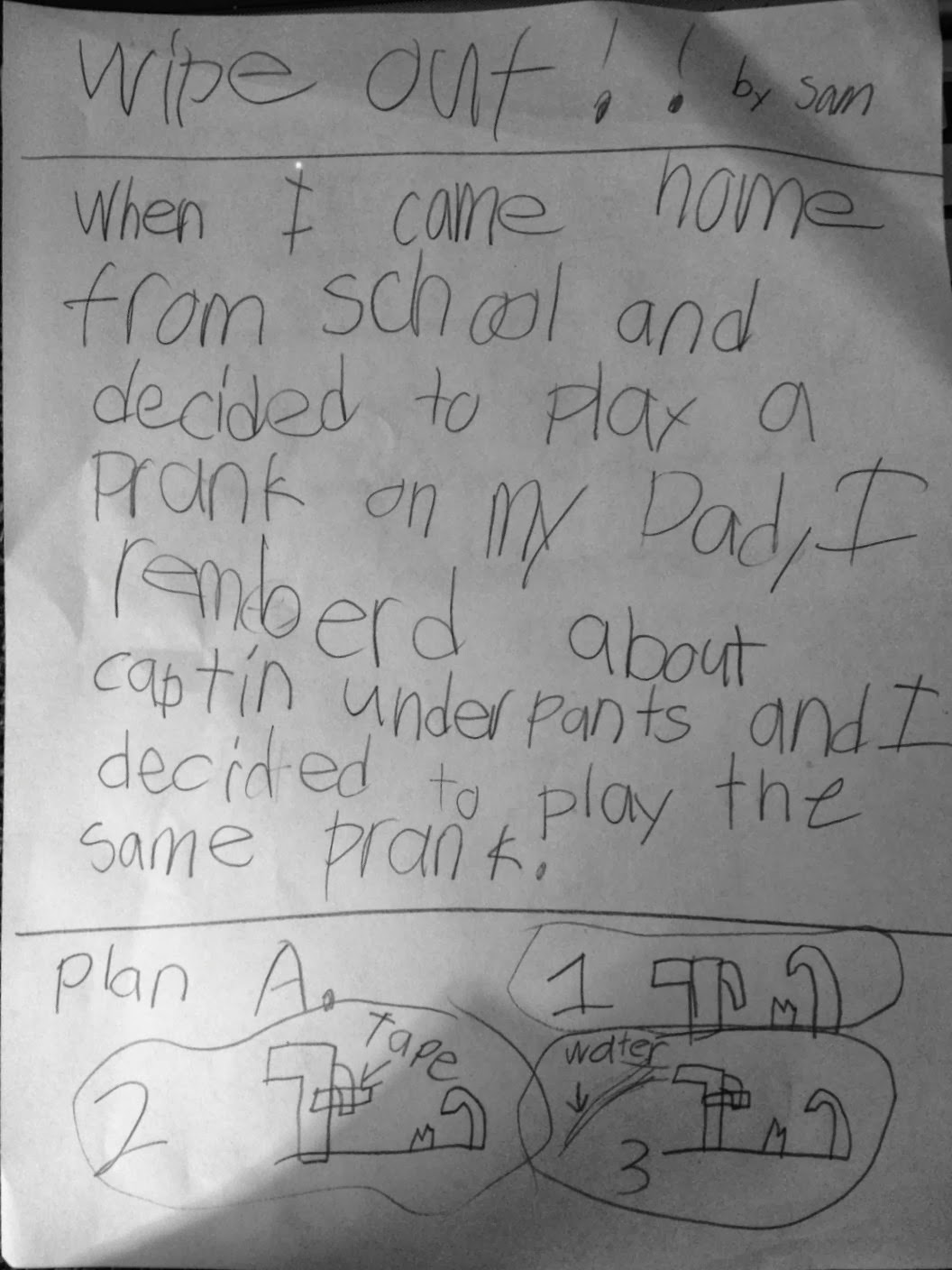 His voice is alive and strong. It’s partly because of the illustrations, however, it is also because of the title, his use of transitions, and the way he talks to the reader. It’s powerful for students to know HOW they are creating voice, not just that they have a strong voice. If this were the compliment in the conference, I can see a teaching point in nudging him to add more voice to his final illustration. In the PLAN A illustration, he uses labels and numbers to help build suspense. He could use an onomatopoeia, speech bubbles or asides to the reader in the ending illustration to bolster his voice.