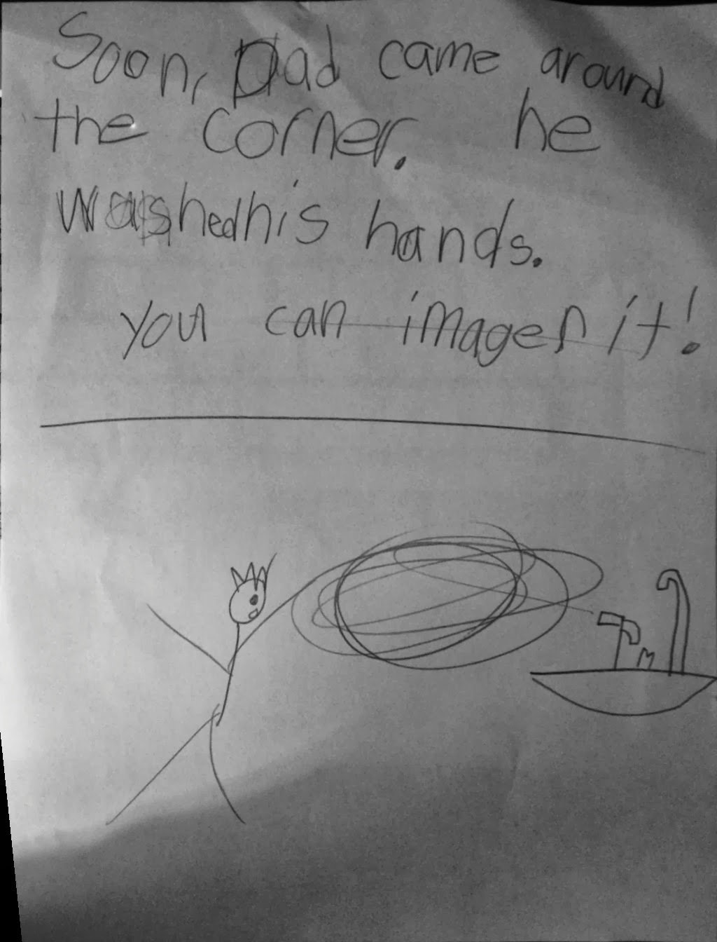 He is combining text and illustration to make meaning. I love his illustration style. It is filled with simple lines and specific details. Before Sam, I would have probably wanted to encourage more color and more “cute-y” details. Now, I’m learning to value the wide range of illustration styles. If he were my student and not my son, I would have probably nudged him to spend more time on the person in the final illustration. He draws great people He ran out of steam on this and since he was on a deadline, he didn’t have time to go back and revise the illustration. (Even if he did have time, I not sure he would have. Sam is a “one-and-done” kind of writer. As a teacher, revision could be a goal I would set for him.)