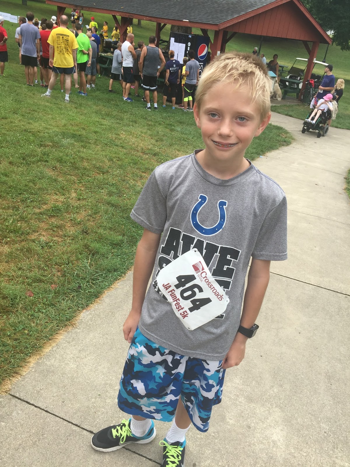 Jordan keeps running to be football strong. He turns on his running legs and chugs until it’s time to stop. He rarely talks, but always keeps churning his legs. The high school football players sat at turns and crossroads to help racers keep the course. They cheered for Jay and he ran faster. He kept plugging along. We ran the last mile together. The high school boy’s soccer team lined the path before the final turn. Jay ran down the line slapping high fives like he was a hero in a big game. His legs quickened and he knew he would make it to the end without stopping.