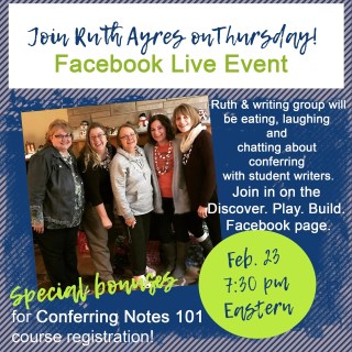 The FB LIVE event was SO MUCH FUN! My writing group was true to form — zany and fun. They talked me into opening the cart early for CONFERRING NOTES 101.