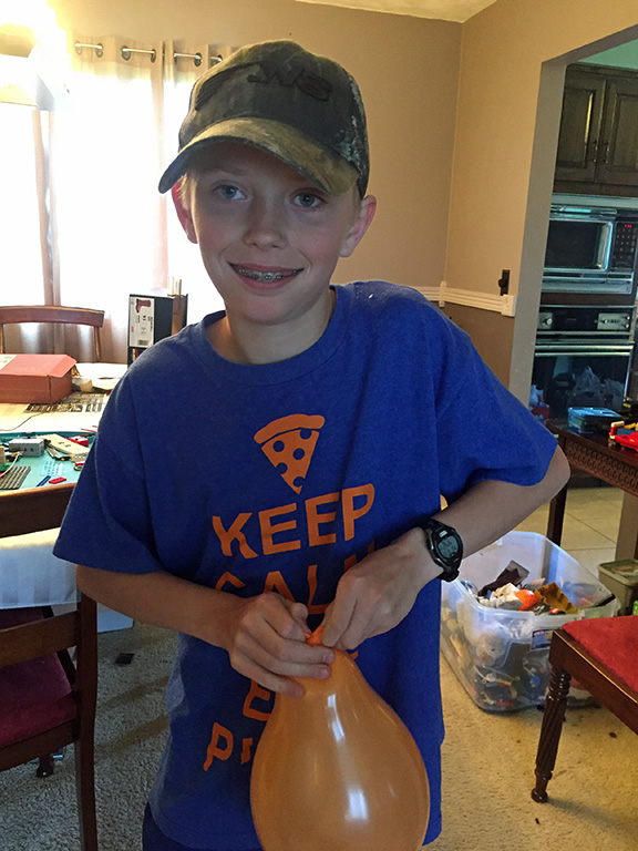 I admire the way Sam is carefree and fun loving. Sometimes I get perturbed by his panache for creativity and the mess left in his wake. This summer he has taken over the dining room and dubbed it his “Inventor’s Studio.” The table is littered with Legos and cardboard; marbles and balloons. He stores large cardboard creations underneath the table. Currently it is the home to the makings of a train engine. The cardboard contraption barely fits under the table. He leaves a trail in his creative wake, much like Hansel and Gretel dropped bread crumbs. Sam leaves scissors and cardboard scraps; lengths of yarn and fallen domino runs, the hot glue gun on the counter, the mat on the table with paint brushes in water. Often he is no where in sight because he’s in the basement working on his train layout or outside, riding his bike, shooting baskets, digging in the back yard, starting a fire in the fire pit…