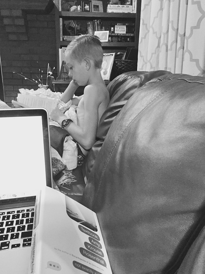 Sam said, “I could play video games, but I’d rather sit on the couch together while you write and I read. Do you mind, Mom?”