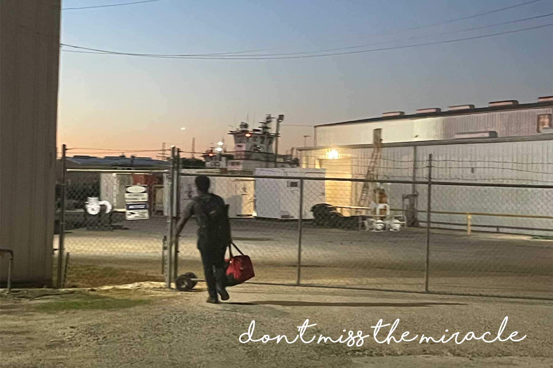 Now, here we are, it seems like we’re standing on the edge of the world. Boats will take him into the gulf. He’s been 19 for a handful of days. He makes eye contact and chuckles.